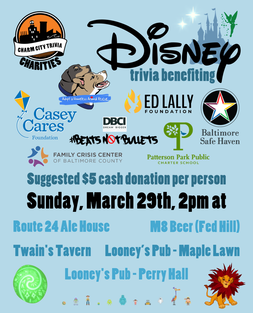 Celebrate Disney magic while giving back! Join Charm City Trivia Charities for Disney Trivia, benefiting multiple local nonprofits — including Adopt A Homeless Animal Rescue.