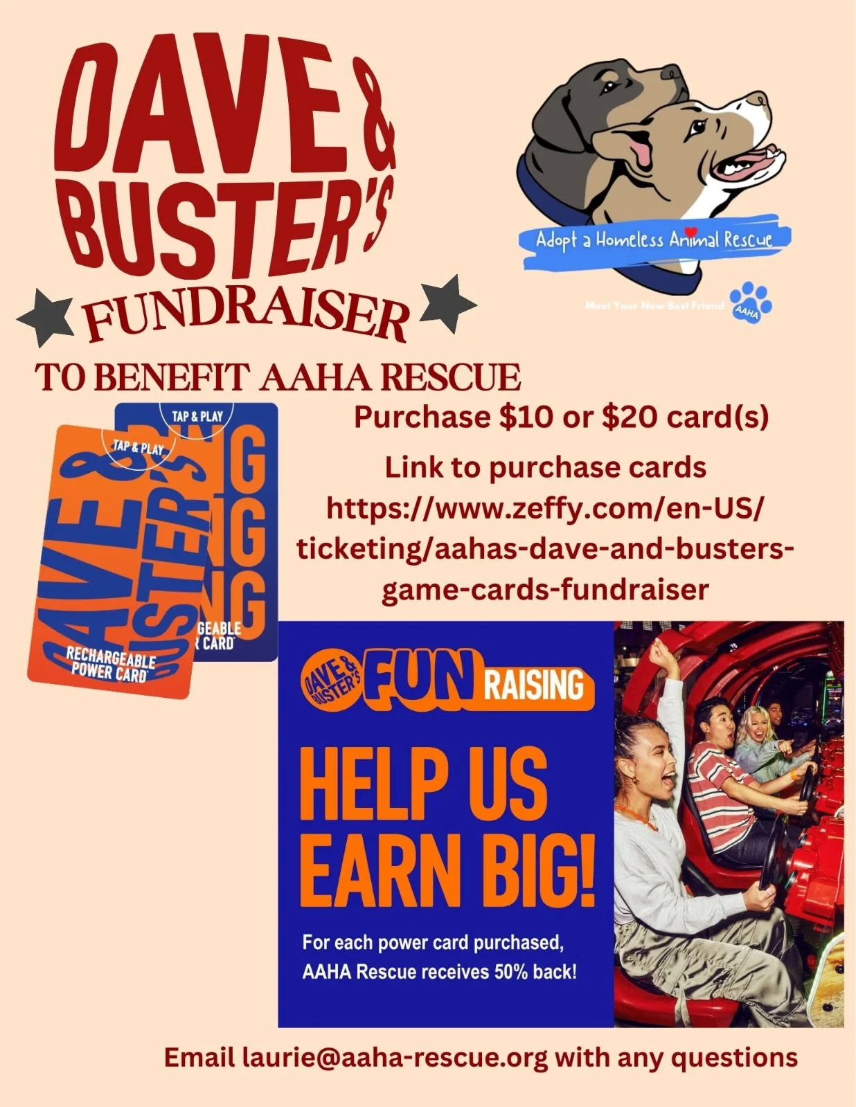 “When you purchase a Dave & Buster's Power Card from our fundraising page, 50% of your order directly supports Pause for Paws! ... Your support helps us save more street dogs!”
