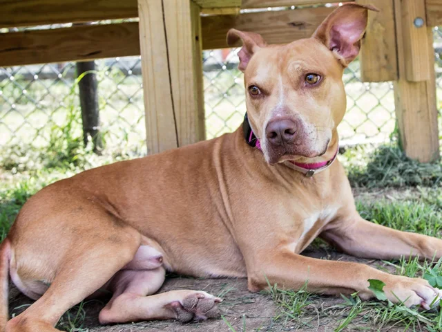 Roo, is a 2-3 year old SWEET chestnut and white pittie mix, weighing about 48lbs. He does well interacting with other dogs, cats, and people, and is not protective of food. Roo started out shy and scared when he arrived as a stray from Crownsville, but he soon warmed up. Now his pleasant, easy-going personality is shining through as he gets to know the volunteers and his new environment.